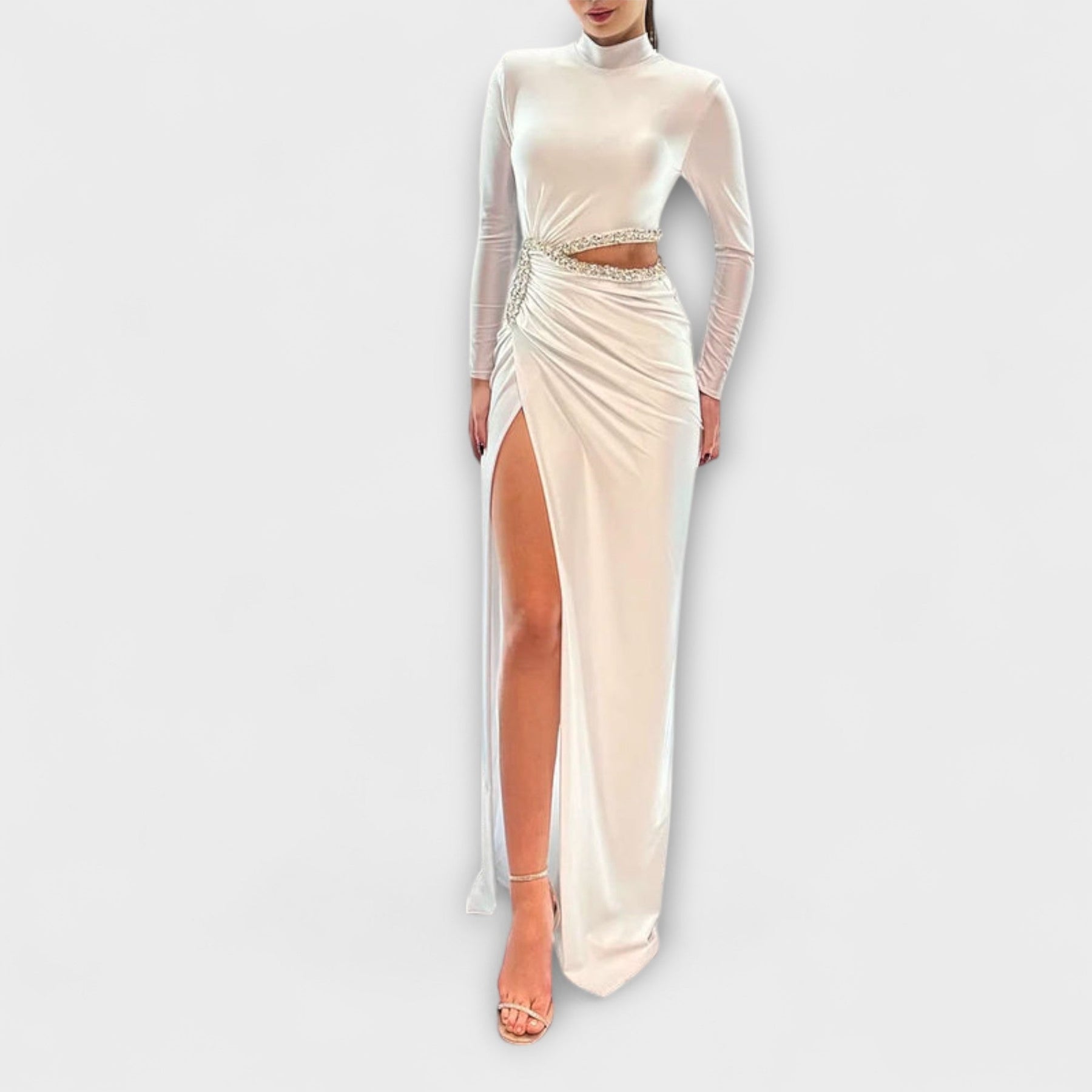 Selah - Bílé šaty s dlouhým rukávem a výřezem v pase s akcenty z kamínků