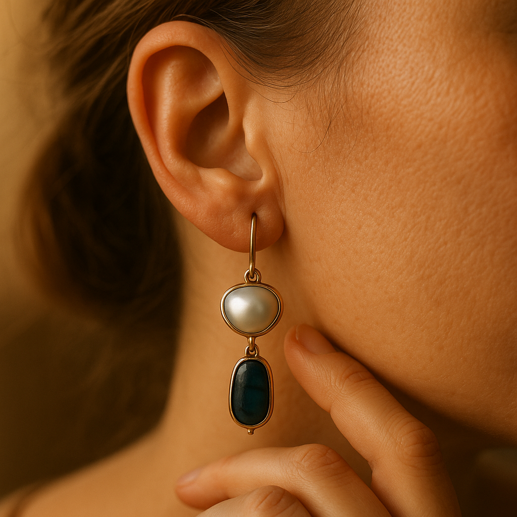 Hluboký modrý kámen připomíná moře při západu slunce, zatímco přírodní perla dodává jemný, měsíční lesk. Tato kombinace evokuje grácii minulých časů a dodává vašemu vzhledu autentický nádech.